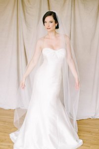 With a sheer, hand-cut edge and slim silhouette this go-with-everything veil lets you and your gown take center stage. Simple lines and a sweep length make this veil almost melt into the back of your gown.?